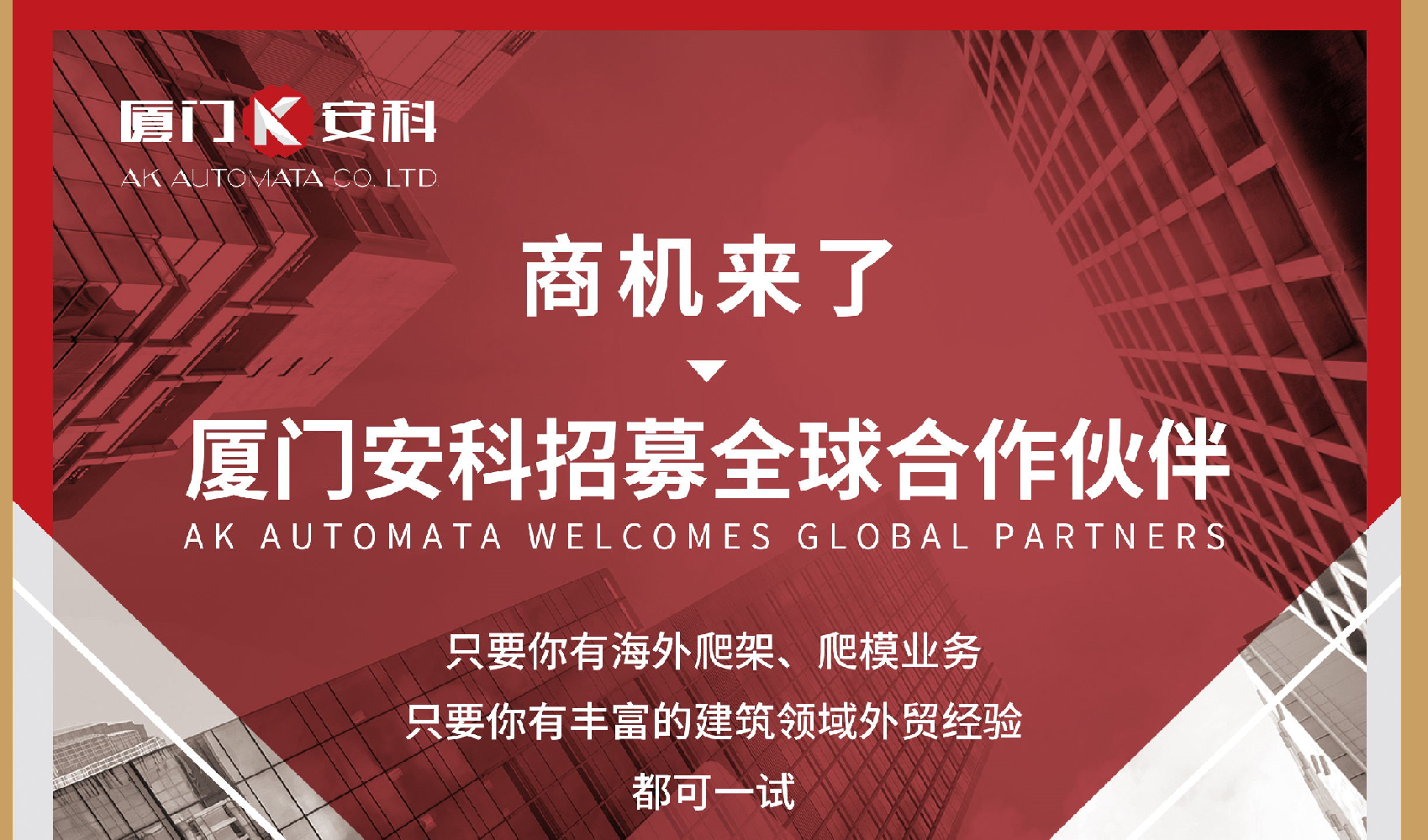 商機(jī)來了,只要你有海外爬架、爬模業(yè)務(wù);只要你有豐富的建筑領(lǐng)域外貿(mào)經(jīng)驗(yàn);都可一試!