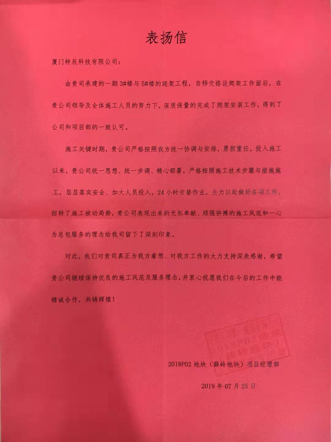 廈門安科旗下子公司——廈門特辰科技有限公司收到一封來自中建八局第一建設有限公司的表揚信。對廈門特辰無私奉獻、頑強拼搏的施工風范和一心為總包服務的理念表示高度贊揚,表揚信的具體內容如下: